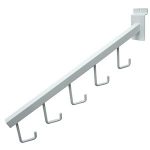 Utilizado principalmente para colgar mercancías, le da la posibilidad de incluir más inventario en el piso de ventas y exhibir de una manera organizada y dinámica. Para utilizar en las planchas Slatwall. Tamaño 16pulgadas de largo. Material: Metal niquelado.