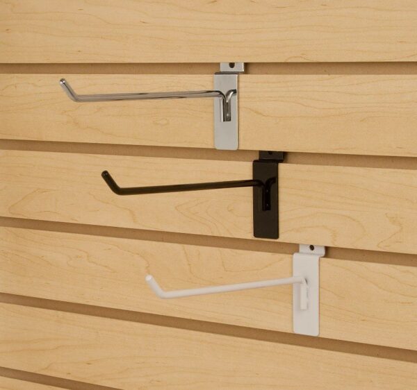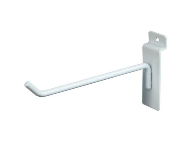Gancho metal Principalmente diseñado para productos pequeños empacados o artículos livianos que cuelgan para usar en las planchas slatwall. Alza de 45 grados al final. Tamaño 8 pulgadas. Material: metal blanco semi-gloss
