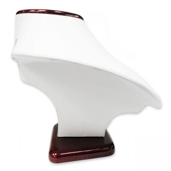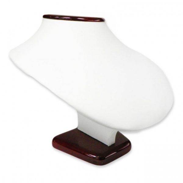 Cuello exhibidor para collar y cadenas blanco con base de madera.
