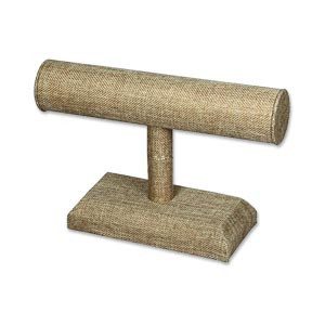 Exhibidor de brazalete de arpillera/yute. Barra en T de pulsera que acomodará varias pulseras a la vez. Tamaño: L: 7.50 ∗ W: 2.75 ∗ H: 5.00 pulgadas. Material: tela de arpillera.