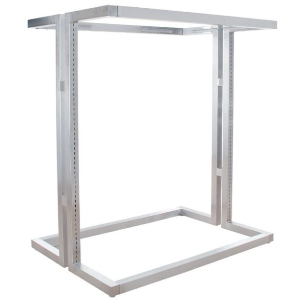 Alta Góndola Multiuso ofrece muchas opciones de visualización. Esta robusta unidad de dos lados de estilo contemporáneo mide 48 «de largo x 34» de ancho x 54 «de alto y está construida con tubos de acero cuadrados con acabado cromado satinado. La unidad incluye solo el marco y aceptará estantes de 48″x 12» Palometas y ganchos para barras, es compatible con todos los accesorios para riel. No incluye tope supior.
